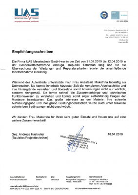 Bei der Zusammenarbeit mit Frau Makotrina vergewisserten wir uns ihrer hohen fachlichen Kompetenz, verantwortungsbewussten Arbeitsweise und hervorragenden Kenntnissen des technischen Bereiches. Wir danken ihr für die produktive Arbeit und hoffen auf eine weitere Zusammenarbeit in der Zukunft.