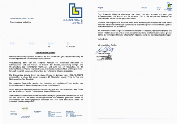 Her quick comprehension and the high technical-technological understanding were particularly impressive, it allowed a very good representation of sometimes very complex issues and clearly contributed to the successful reconstruction and restart of the glass melting tank.