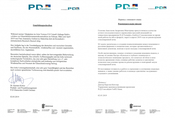 При проведении пуско-наладочных работ стекловаренной печи госпожа Анастасия Макотрина сохраняла холодную голову и добросовестно выполняла свою работу даже в критических ситуациях. А её умение быстро схватывать и понимать технические взаимосвязи очень помогало мне при общении с русскими коллегами.