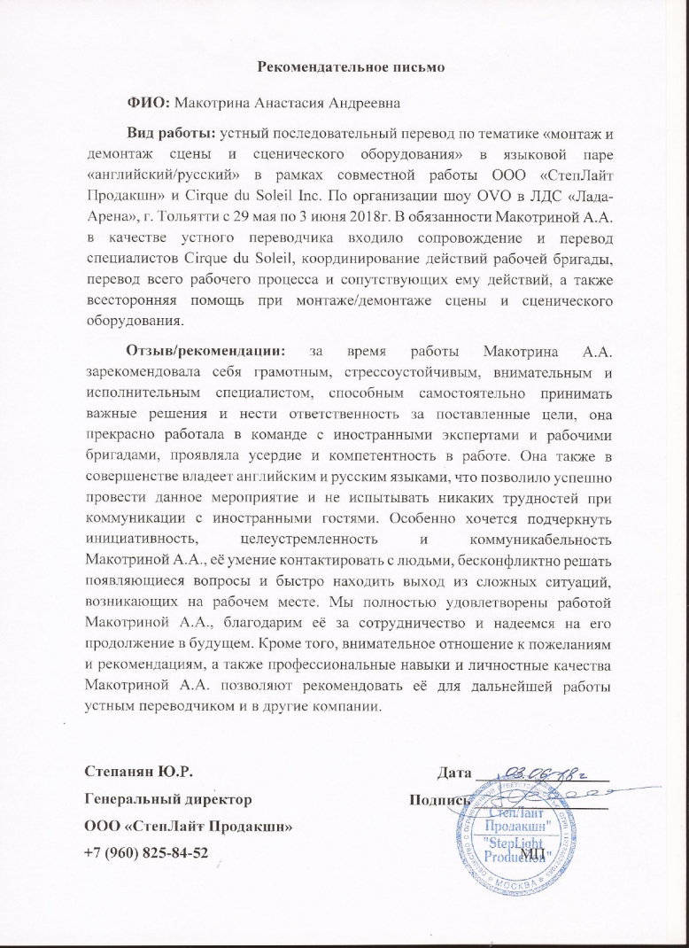 Во время организации шоу OVO Cirque du soleil Макотрина А.А. зарекомендовала себя грамотным, стрессоустойчивым, внимательным и исполнительным специалистом. Кроме того, хотелось бы отметить ее умение контактировать с людьми и бесконфликтно решать появляющиеся вопросы.